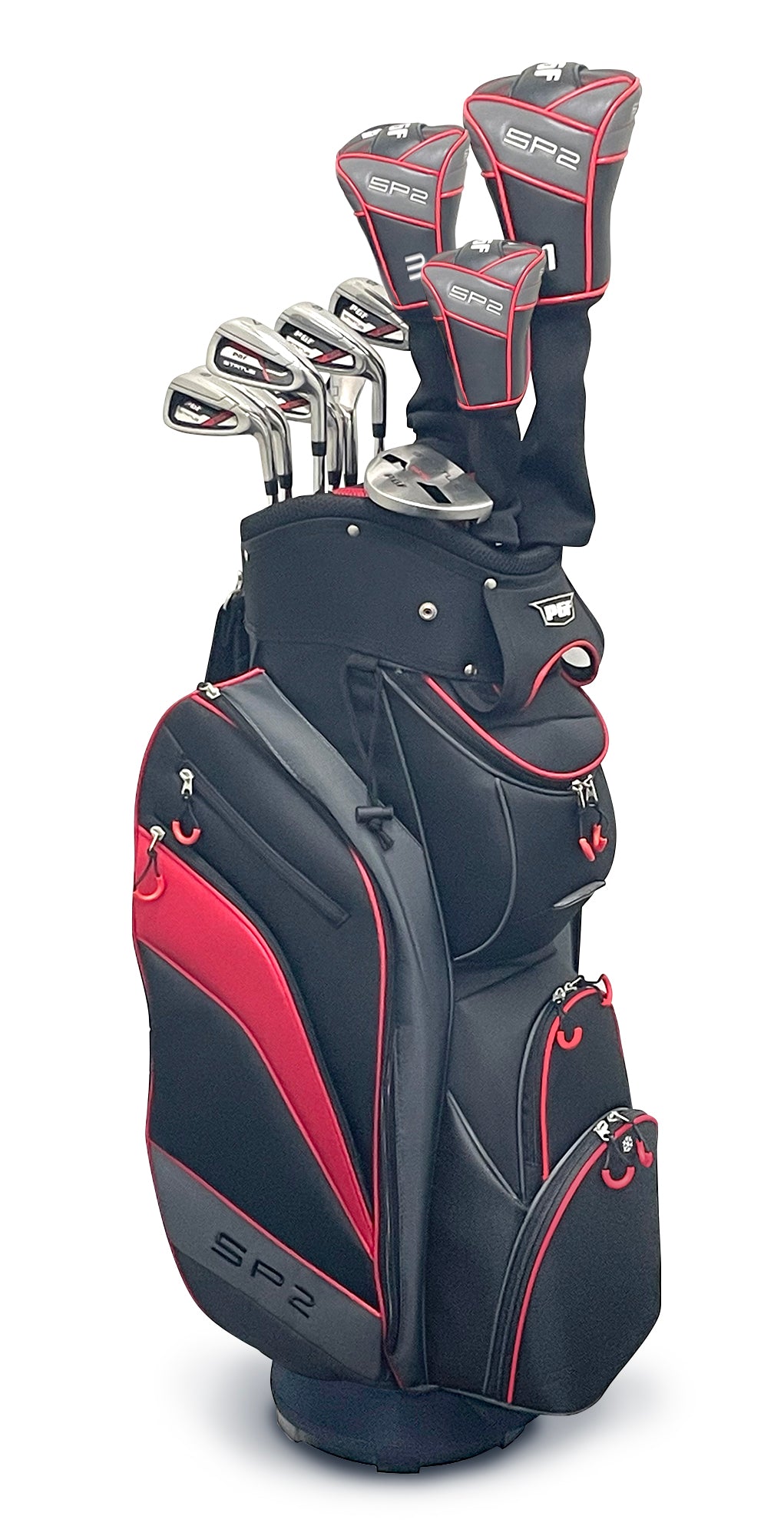 launch the ball higher with extra forgiveness and longer carry. The SP2 packages include a 6-4 Titanium Driver, Stainless Steel Fairway and Hybrid all in Black PVD finish. The oversize, stainless SP2 irons feature an undercut cavity for extra forgiveness. The CNC milled specialty 56 deg wedge compliments the set and Stainless Mallet SP2 Putter features an oversize pistol grip. The SP2 set is packaged with a premium 9-pocket cart bag with 14-way top, external putter tube, cooler/ball pocket and premium matching SP2 headcovers